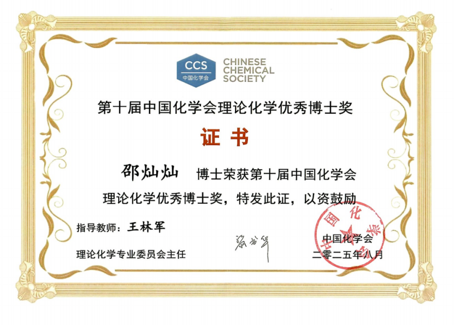 近日,从中国化学会理论化学专业委员会传来喜讯,经过严格评审,我校智能制造学院青年教师邵灿灿博士在激烈的竞争中脱颖而出,荣获“第十届中国化学会理论化学优秀博士奖”。这一奖项是对邵灿灿博士在读博期间研究工作的充分肯定,也彰显了我校在引进和培养高层次青年人才方面取得的显著成效。