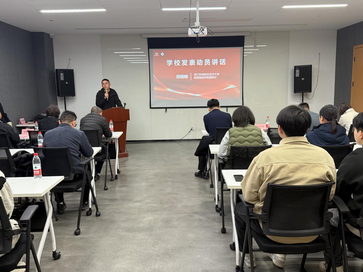 智能制造学院副院长郑晓峰发表动员讲话,他强调,现场工程师项目作为教育部立项项目,是校企协同育人的生动体现,他指出,入企实践是学校人才培养方案中的重要环节,更是学生将课堂所学转化为实际技能、提前适应职场环境的宝贵机会。他对学生们提出两点希望:一是严守安全第一要义,在实习过程中遵守企业规章制度,展现浙江机电学子的良好风貌;二是把握宝贵的实践机会,踏实实干,能以谦逊的态度主动学习,以严谨的作风对待工作,以坚韧的意志克服困难,学有所成。