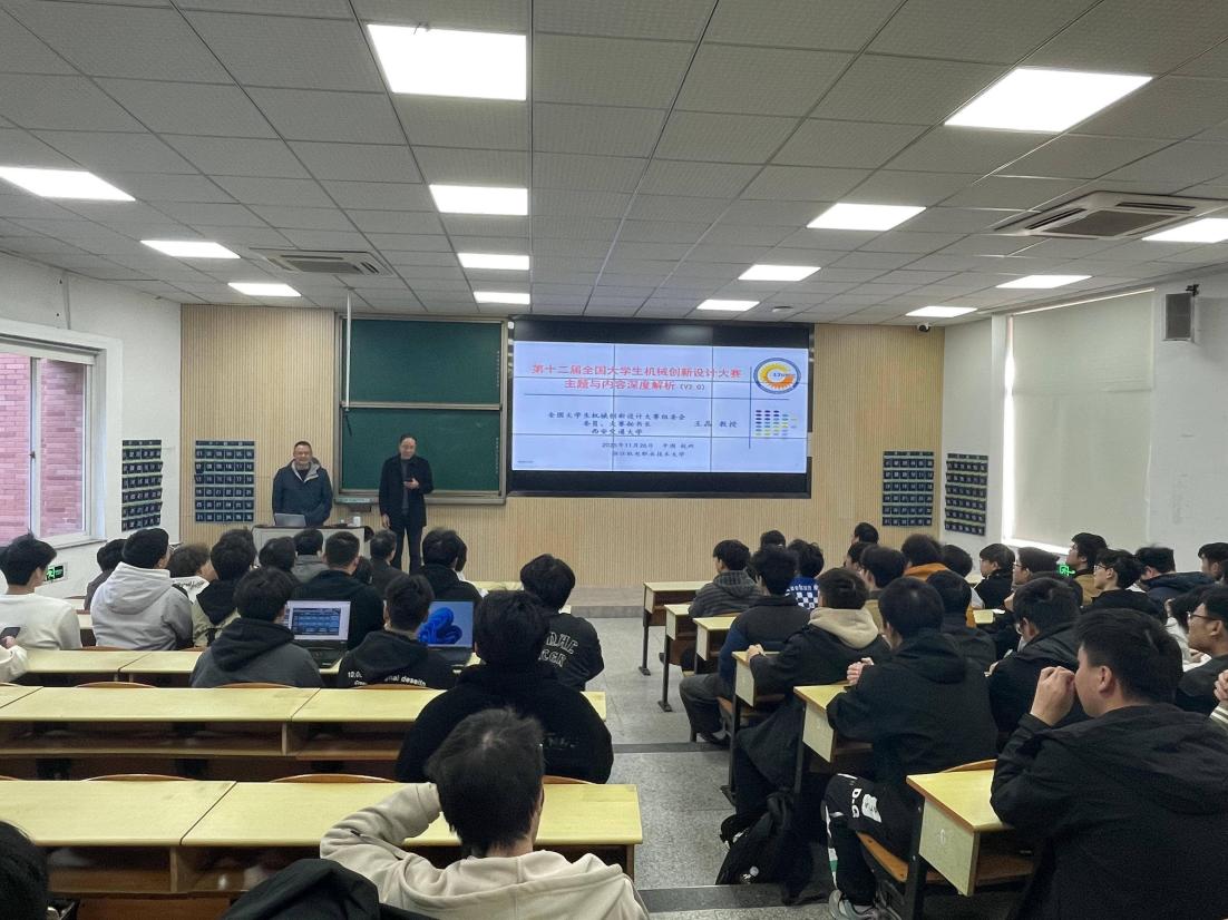 11月26日,智能制造学院特邀全国大学生机械创新设计大赛组委会委员、秘书长,西安交通大学王晶教授来校作题为《第十二届全国大学生机械创新设计大赛主题与内容深度解析》的专题报告。智能制造学院党委书记程方启、副院长吕永锋以及学院100余名师生共同参加了王晶教授的报告会。 报告会上,王晶教授结合多年大赛组织和评审经验,为在场师生带来了一场权威解读。王教授首先回顾2003年以来大赛所取得的显著成果,梳理了大赛的发展历程与重要变革,并鼓励学生创新要紧扣发展需要。随后,王教授围绕2026年第十二届全国赛“灵巧·智能,美好生活”的主题与内容进行了深入剖析,分别对“水产品初加工机械”、“叶菜洁净化处理包装一体化机械”和“高性能仿生蝴蝶”三大选题进行详细讲解,从选题要求、技术难点、创新要点及评审规则等方面进行解析,激发学生设计灵感。 报告结束后,王晶教授与在场师生进行了深入细致交流,并对现场师生提出的问题做了详细解答,使大家受益匪浅。 近年来,智能制造学院坚持“以赛促教、以赛促学、以赛促改”,不断提升人才培养质量,在大学生机械创新设计大赛上已取得国家级一等奖7项,省级一等奖20余项,并有多个作品在学院的持续支持和师生的持续优化后,在中国国际大学生创新大赛、挑战杯系列竞赛上取得优异成绩。后续,学院将以此次报告会为契机,鼓励师生积极备赛2026年全国大学生机械创新设计大赛,并争取获得优异成绩。