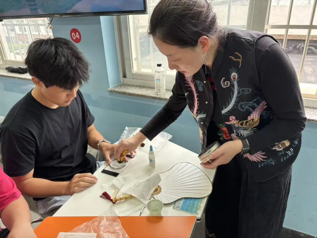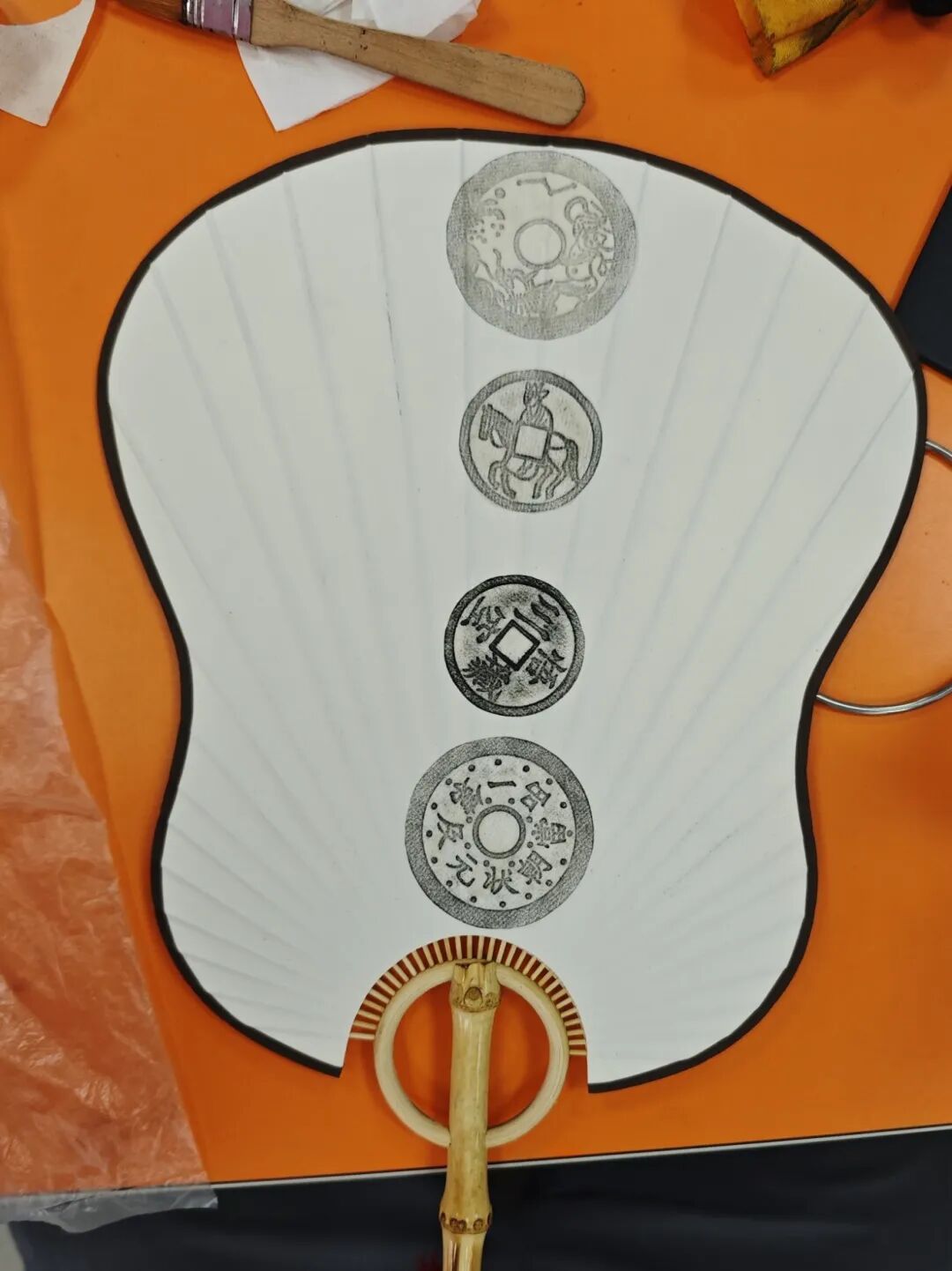 拓印完成后,同学们将带有古币纹样的宣纸精心裁剪,装裱在素面团扇上。20把团扇各具特色,有的古朴典雅,有的创意十足,原本朴素的团扇瞬间变身成为充满文化韵味的艺术品,每一把都承载着独特的历史印记。